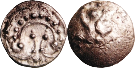 Rv: lineární torques s kuličkami na koncích vně lemovaný oblou linií z kuliček, vně torquesu oblá linie se symetricky zatočenými konci do středu plochy pod torques – při zakončení na každé linii tři kuličky, dole při okraji čtyři kuličky vodorovně (mimo mincovní plochu)